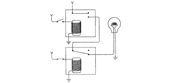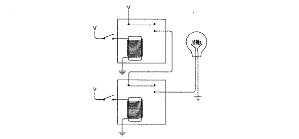 下图电路的两个继电器串联。当两个开关都断开时,灯泡不发光。