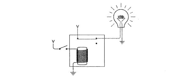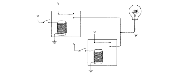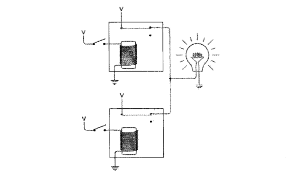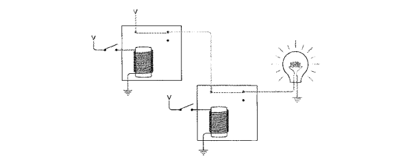 下图的电路使用了另一种连接方式,在开关断开时灯泡被点亮,与之前的电路相反。以这种方式连接的继电器叫做反向器(inverter)。反向器不是逻辑门。