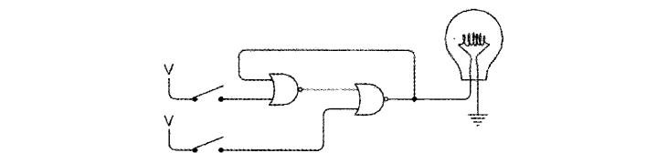 以下电路中包含两个或非门、两个开关和一个灯泡。