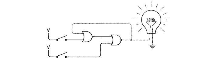 电路的奇怪之处是:同样是在两个开关都断开的状态下,灯泡有时亮着,有时却不亮。当两个开关都断开时,电路有两个稳定态,这类电路统称为触发器(Flip-Flop)。
