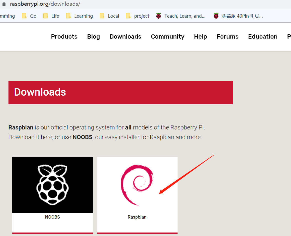 官网下载树莓派操作系统,注意下载箭头所指的 Raspbian(NOOBS 的安装方式跟这个不太一样):