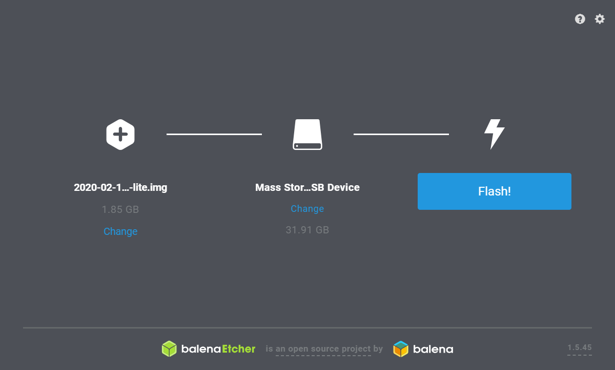 用 Etcher 将操作系统写入 SD 卡,如图选择系统镜像以及 SD 卡,点击 Flash! 即可: